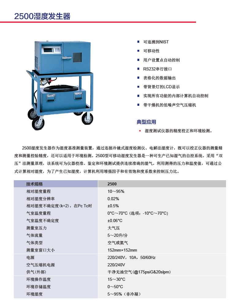 2500湿度发生器作为湿度基准测量装置,通过连接冷镜式湿度检测仪、电解法湿度计,既可以校正仪器的测量精度和测量校验精度,还可以适用于环境检测。2500型可移动湿度发生器是一种可生产已知湿气的自控系统。采用“双压”法测量原理,该系统可为仪器校准、鉴定和环境测试提供连续准确的湿气。